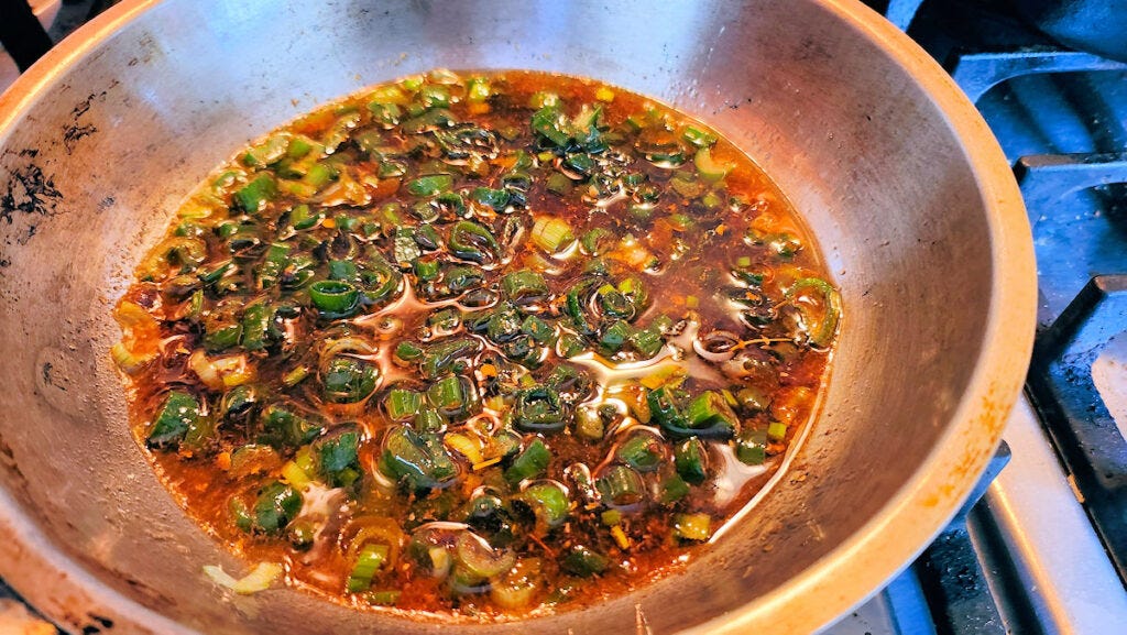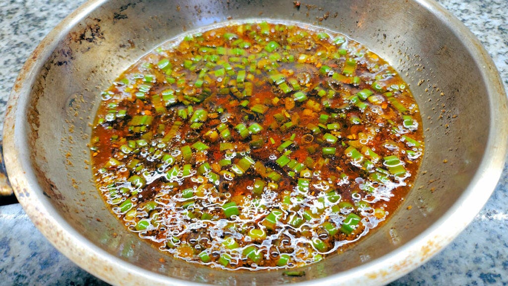 Over low to medium heat, fry the green onions, and the two spices in the oil for a few minutes. You want to just get it to the point where the green onions would start to brown if you kept going.