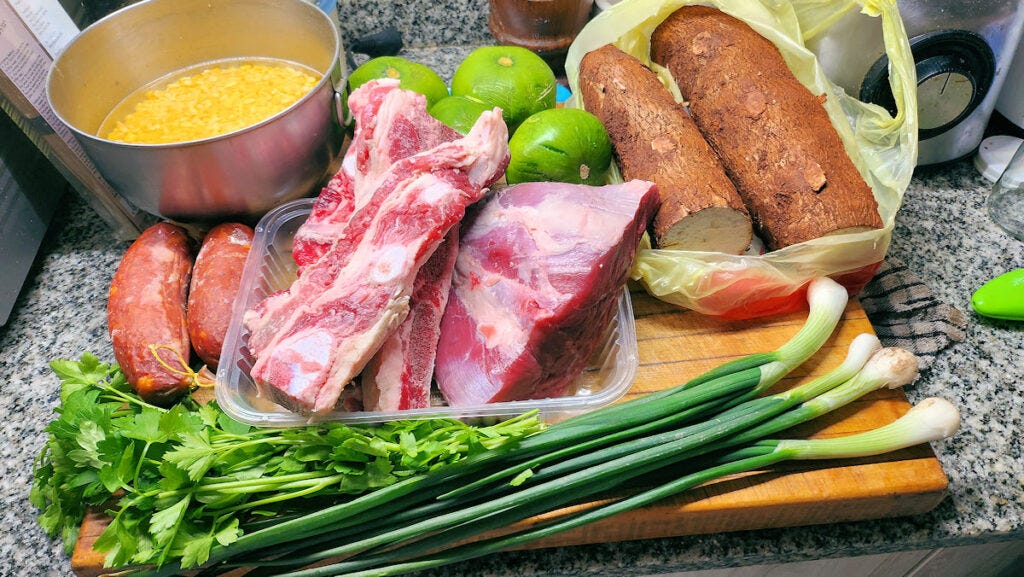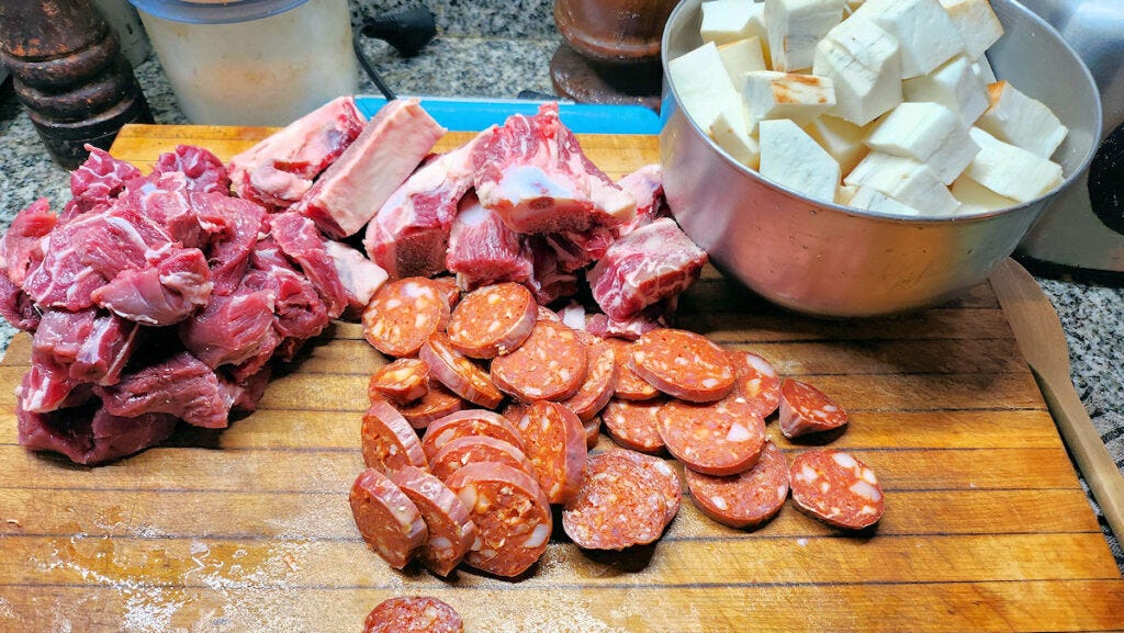 Prepare the yuca root - this is probably the most time consuming step. I've gone through the process in detail here, the only difference being here I cut it in roughly 1" cubes. Slice the chorizo, trim and cut the ribs into sections, trim and cut the other beef into cubes.