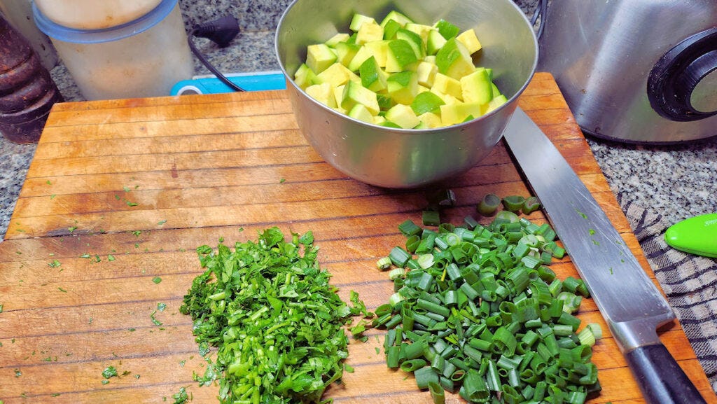 Cut the zapallitos in small cubes, chop the green onions and parsley.