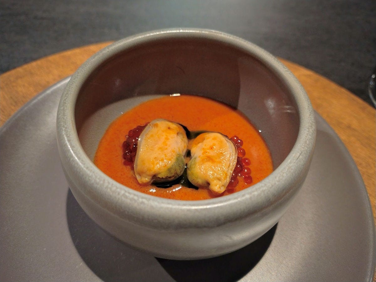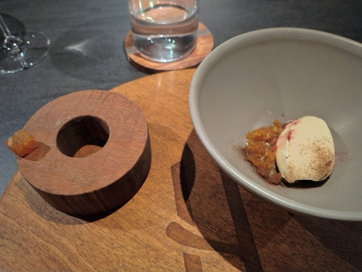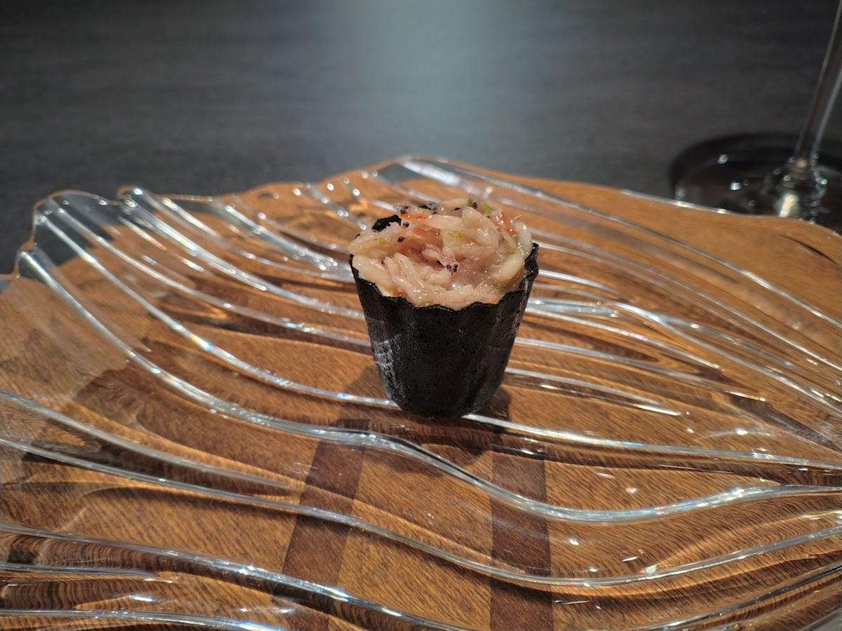 Assuming I got this right - a nori cup filled with a bell pepper and strawberry yogurt, topped with kimchi and krill. I found it a bit too salty for my tastes, even with the balance of the yogurt. The one dish the entire evening I wasn’t excited about.