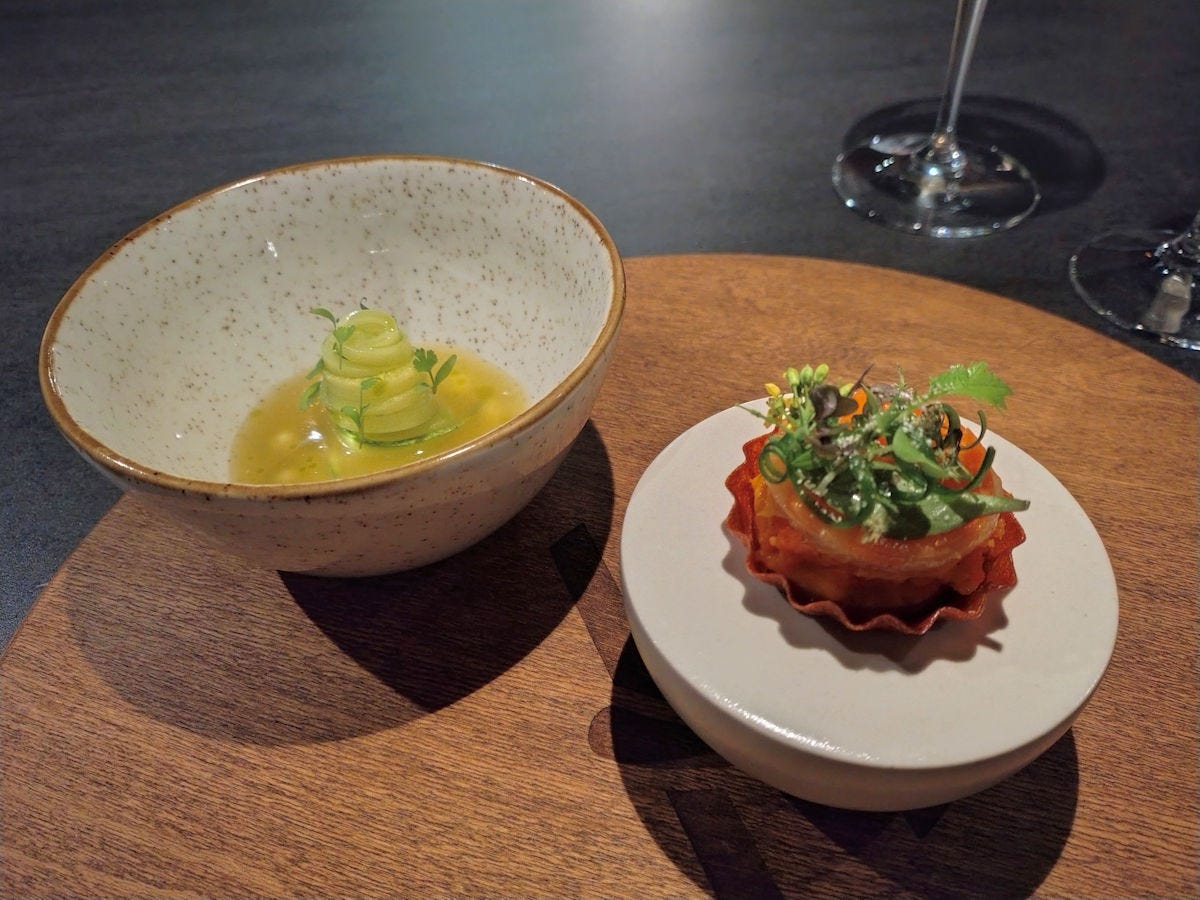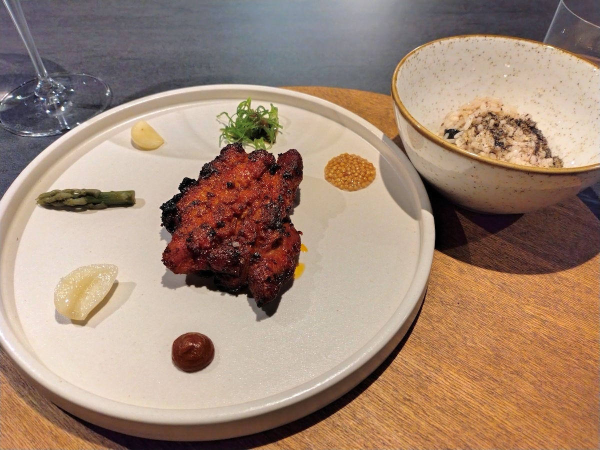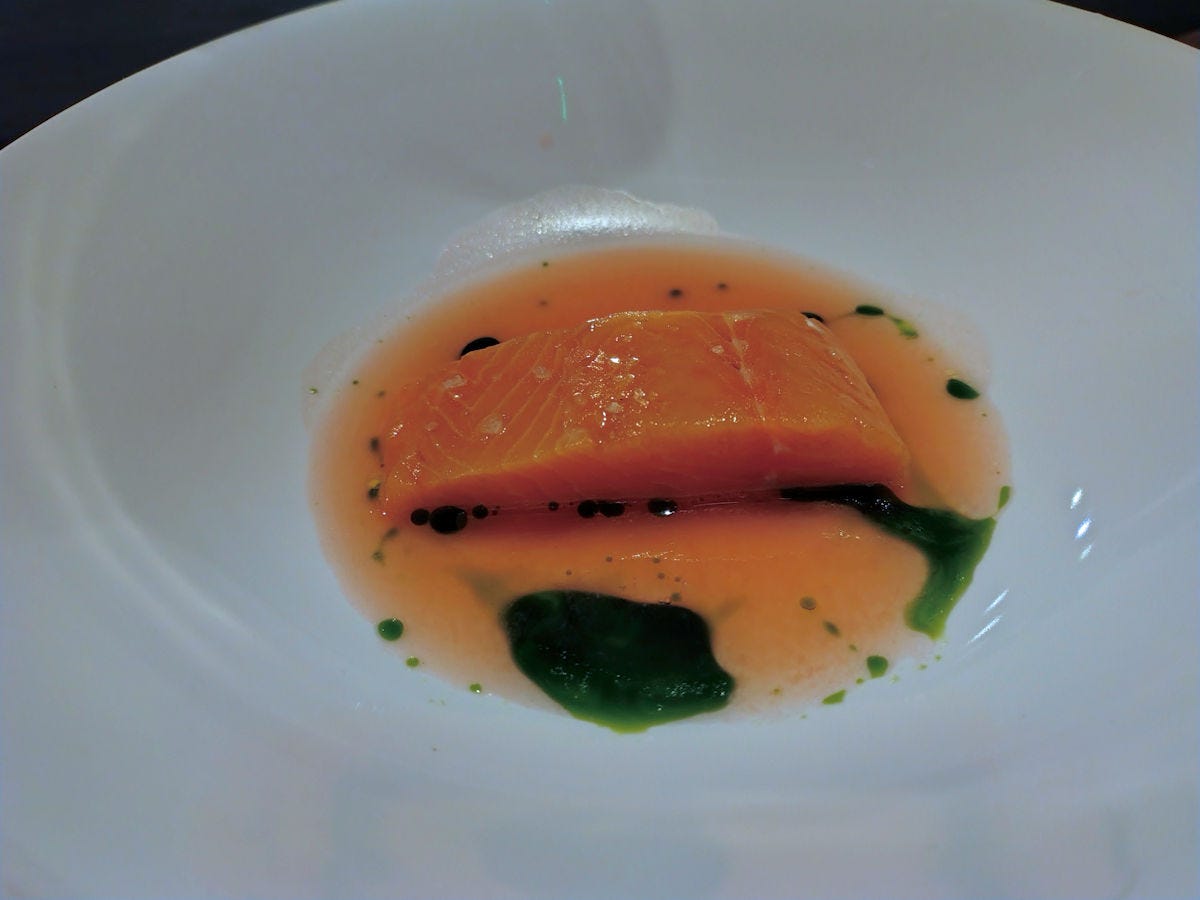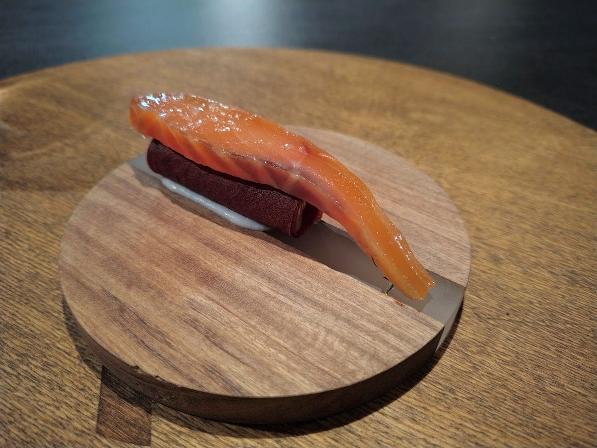 Assuming I got this right - a nori cup filled with a bell pepper and strawberry yogurt, topped with kimchi and krill. I found it a bit too salty for my tastes, even with the balance of the yogurt. The one dish the entire evening I wasn’t excited about.
