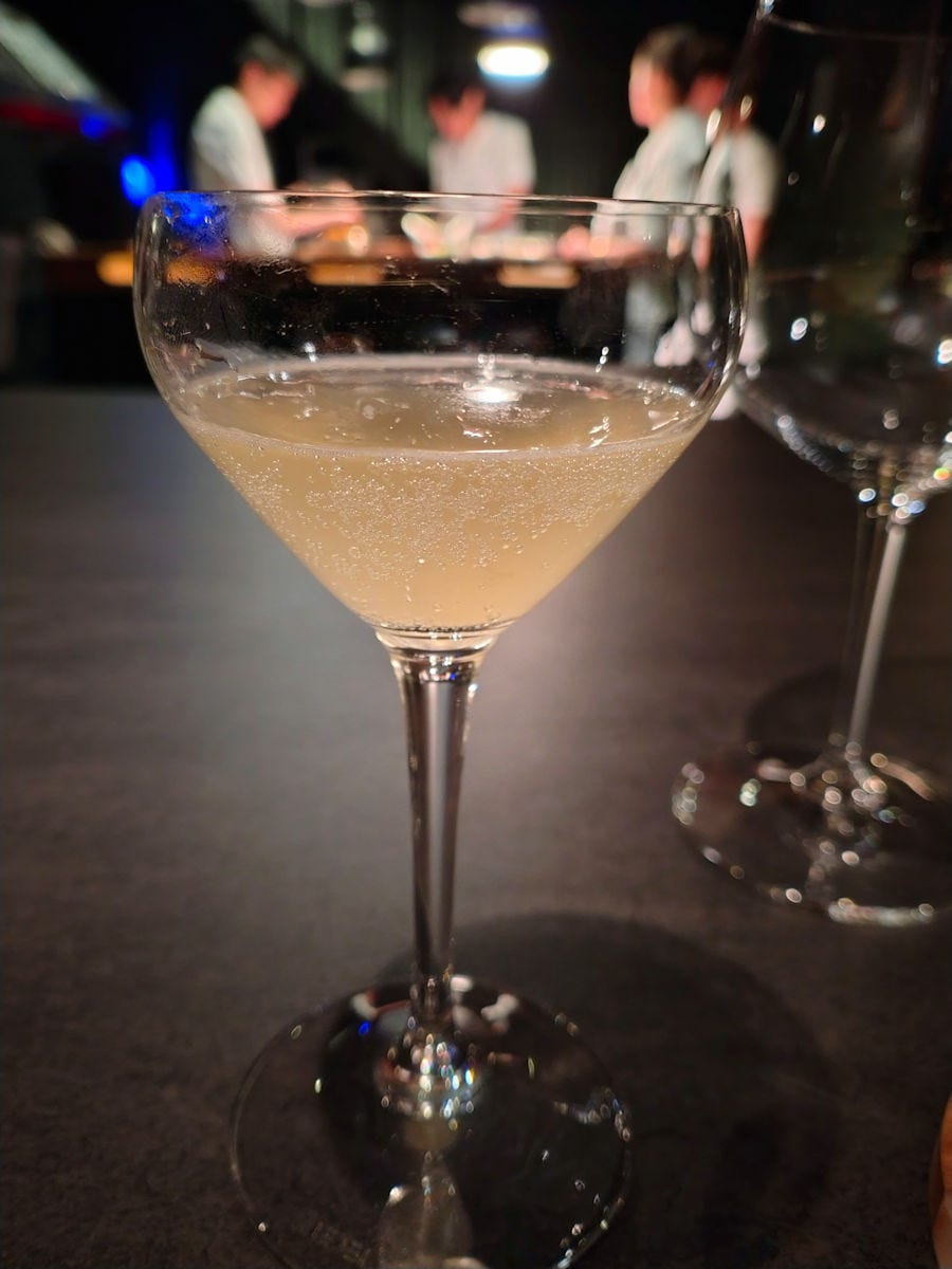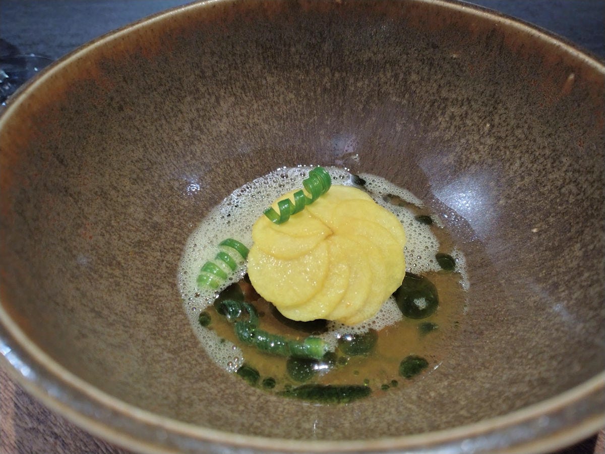 The kitchen was being run by his sous chef, Pío Yoon. There are no waiters - the kitchen staff both serve and clear the dishes. There is a sommelier, who offered a few different options (I’d decided not to go with the rather pricey pairing, plus these days I just don’t drink that much). When I couldn’t decide between two wines he offered, he suggested a half glass of each, one at a time, for the beginning and later parts of the menu. That works. Albeit he charged me for one glass a the more expensive price. And, I’d note - the wine list prices are around three times retail pricing, which is pretty high for anywhere, but Buenos Aires in particular, where restaurant wine prices are often not that much more than retail.