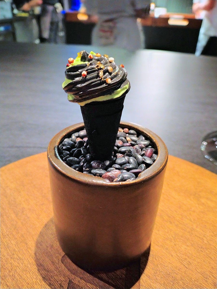 Squid ink cone filled with sriracha prawn and fennel salad (they do like their fennel), and coated with wasabi and squid ink purees, and a little edible gold.
