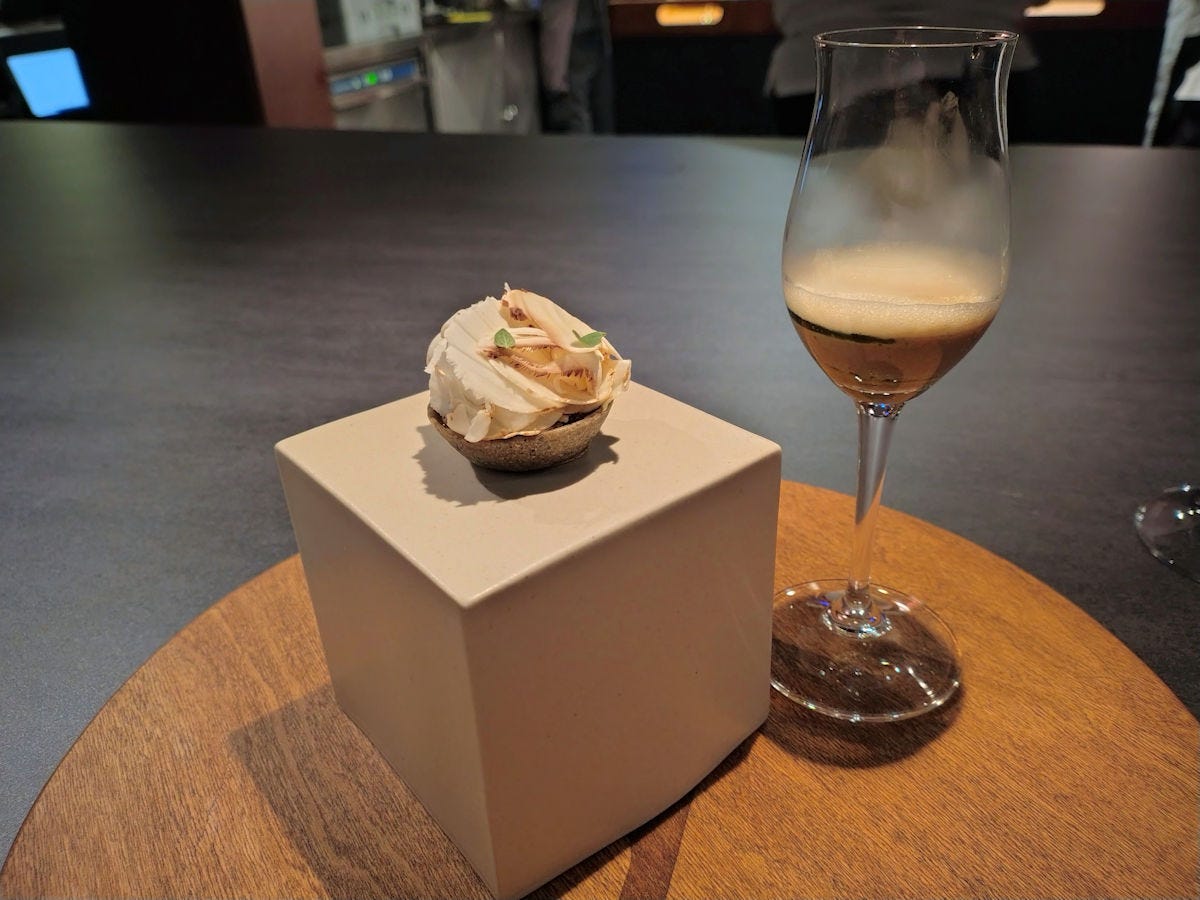 Maybe my favorite dish. A misugaru (a Korean multigrain mixture that’s used as a flavoring agent) and mushroom puree tartlet, black bean emulsion, coffee and vinegar pickled cherry, gochugaru (Korean chili powder), and on the side, a mushroom coffee with lemon verbena foam. Absolutely stunning in complexity and depth of flavor.